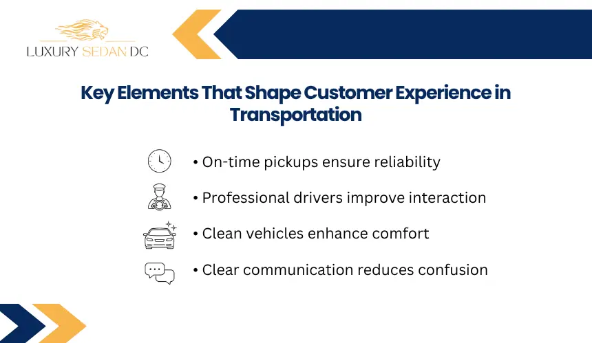 Customer experience in transportation is influenced by several operational and service-related factors that directly affect how passengers perceive a trip. These elements determine whether transportation feels smooth, reliable, and comfortable or stressful and unpredictable. In modern mobility services, transportation providers focus on improving these core service areas to enhance the overall customer experience in transportation services.