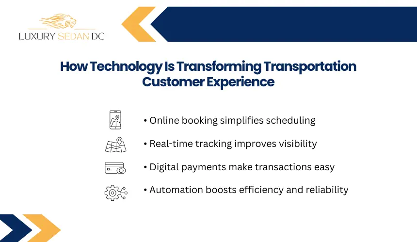 Technology improves transportation customer experience by simplifying booking, improving communication, and increasing service transparency. Digital booking platforms allow passengers to schedule rides quickly, while real-time tracking systems provide updates on vehicle arrival times. Automated dispatch systems and digital payments also streamline trip coordination and reduce delays during the transportation process.