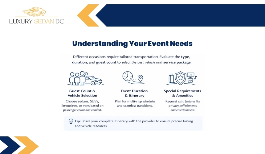 - Choose vehicles based on group size and event type.