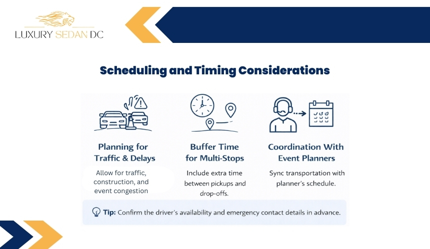If an event has a planner, coordinating transportation ensures synchronization with schedules, venue access, and guest management for a seamless experience.