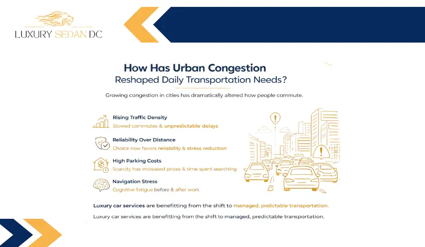 In high-density urban centers, daily driving is becoming less practical due to traffic congestion, limited parking, and rising ownership costs. Professionally managed transportation offers an alternative where: